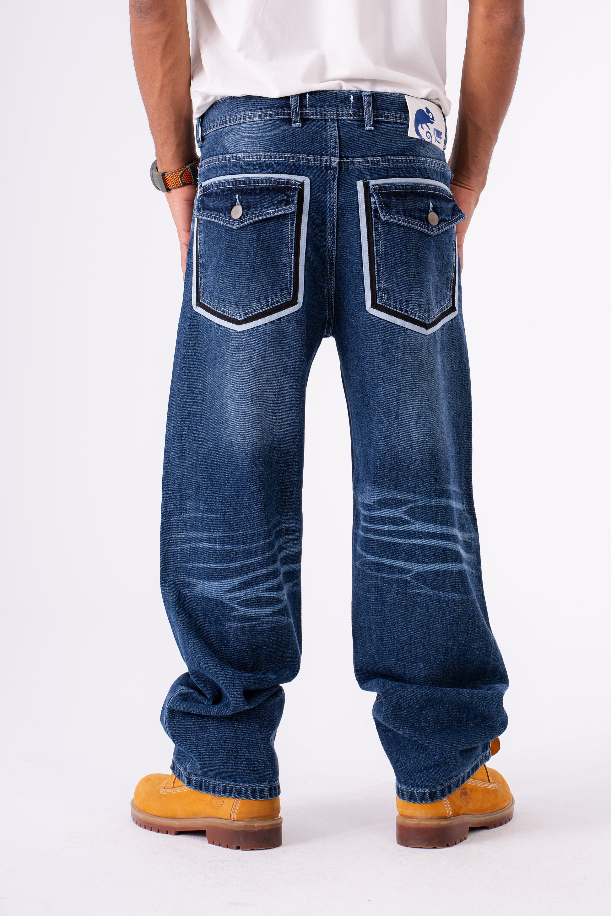 The white pocket baggy made for versatility and visual impact, perfectly blending the durability of traditional denim with a dynamic, street-ready aesthetic. The structured, Flap-and-Button Utility Pocket.